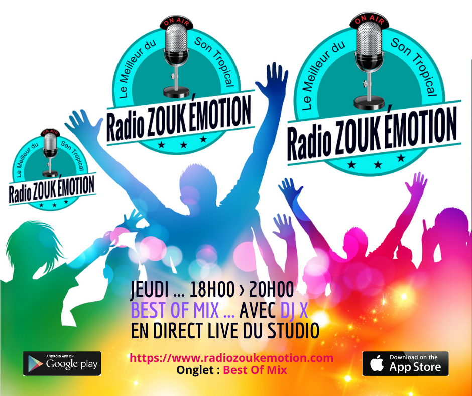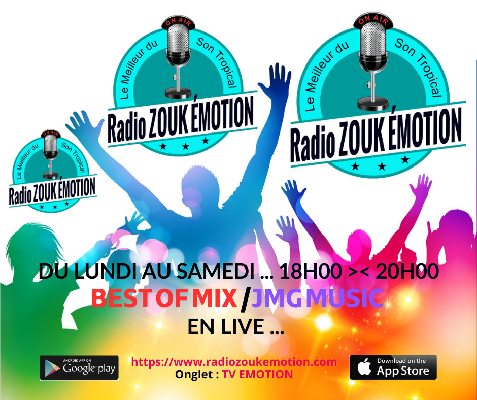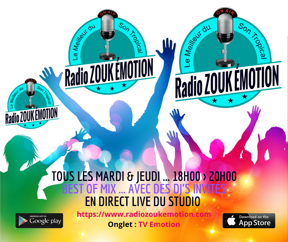 Du Lundi au Samedi … de 18h00 à 20h00, écoutez vos MIX préférés en live de notre studio, et en écoute sur votre smartphone. Pour cela téléchargez gratuitement l’application “Radio Zouk Emotion” sur Google Play ou Apple Store.